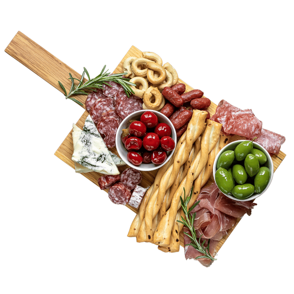 verschiedene Sorten Käse, Wurst, Oliven und Peperoni